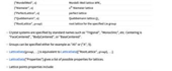 - LatticeData["Properties"] gives a list of possible properties for lattices.