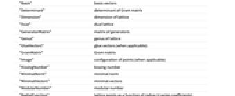 "Basis" basis vectors "Determinant" determinant of Gram matrix "Dimension" dimension of lattice "Dual" dual lattice "GeneratorMatrix" matrix of generators "Genus" genus of lattice "GlueVectors" glue vectors (when applicable) "GramMatrix" Gram matrix "Image" configuration of points (when applicable) "KissingNumber" kissing number "MinimalNorm" minimal norm "MinimalVectors" minimal vectors "ModularNumber" modular number "RadialFunction" lattice points as a function of radius (