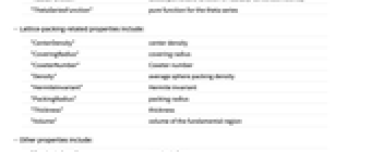 "CenterDensity" center density "CoveringRadius" covering radius "CoxeterNumber" Coxeter number "Density" average sphere packing density "HermiteInvariant" Hermite invariant "PackingRadius" packing radius "Thickness" thickness "Volume" volume of the fundamental region - Other properties include: