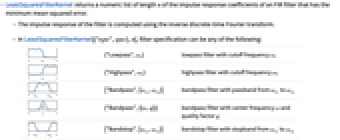 - In LeastSquaresFilterKernel[{"type",spec},n], filter specification can be any of the following:
