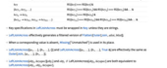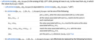 key join ai and bj, when the value associated with key is the same {key1,key2,…} all the values associated with each keyi need to be the same in each matched pair keyakeyb the value associated with keya in ai must be the same as the value associated with keyb in bj {keya1keyb1,keya2keyb2,…} match the value associated with keyai in ai with the value associated with keybj in bj func join the pairs ai, bj whenever func[ai,bj] is True - In LeftJoinAcross[{a1,a2,…},{b1,b2,…},keyspec], keyspec can effectively be replaced by the following functions: