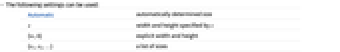 Automatic automatically determined size s width and height specified by s {w,h} explicit width and height {s1,s2,…} a list of sizes
