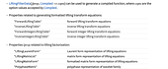 "ForwardLiftingTable" forward lifting transform equations "InverseLiftingTable" inverse lifting transform equations "ForwardIntegerLiftingTable" forward integer lifting transform equations "InverseIntegerLiftingTable" inverse integer lifting transform equations - Properties lprop related to lifting factorization:
