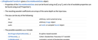 list arbitrary-rank numerical array image arbitrary Image object audio an Audio or sampled Sound object - The possible wavelets wave include:
