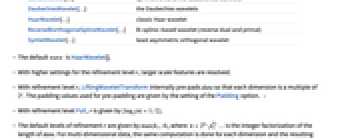 BiorthogonalSplineWavelet[…] B-spline-based wavelet CDFWavelet[…] Cohen-Daubechies-Feauveau 9/7 wavelet CoifletWavelet[…] symmetric variant of Daubechies wavelets DaubechiesWavelet[…] the Daubechies wavelets HaarWavelet[…] classic Haar wavelet ReverseBiorthogonalSplineWavelet[…] B-spline-based wavelet (reverse dual and primal) SymletWavelet[…] least asymmetric orthogonal wavelet - The default wave is HaarWavelet[].