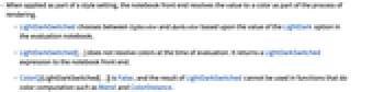 - LightDarkSwitched[…] does not resolve colors at the time of evaluation. It returns a LightDarkSwitched expression to the notebook front end.