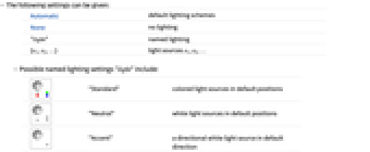 - Lighting can be specified separately for particular objects in Graphics3D by giving a style option Style[obj,Lighting->spec].