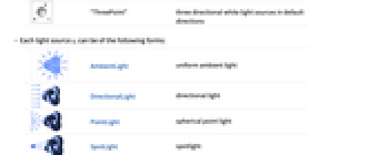 AmbientLight uniform ambient light DirectionalLight directional light PointLight spherical point light SpotLight spotlight - Lighting{s1,…} combines the light sources si with any inherited light sources. To prevent combining with inherited light sources, use Lighting{None, s1,…}.