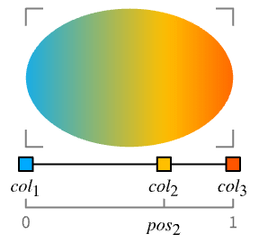 - LinearGradientFilling[{pos1,pos2,…,posn}{col1,col2,…,coln}] specifies colors coli to use at the scaled position posi taken to be relative to the width of the graphic object.