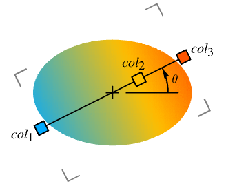 - With a numerical value θ, LinearGradientFilling[…,θ] specifies the straight line with angle θ and the orientation of the gradient in direction vector {Cos[θ],Sin[θ]}.