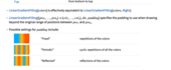 - LinearGradientFilling[{pos1,…,posn}{col1,…,coln},dir,padding] specifies the padding to use when drawing beyond the original range of positions between pos1 and posn.