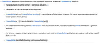 - LinearSolve works on both numerical and symbolic matrices, as well as SparseArray objects.