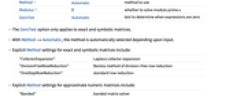 "CofactorExpansion" Laplace cofactor expansion "DivisionFreeRowReduction" Bareiss method of division-free row reduction "OneStepRowReduction" standard row reduction - Explicit Method settings for approximate numeric matrices include: