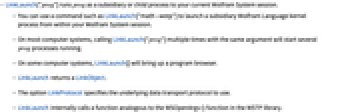 - LinkLaunch["prog"] runs prog as a subsidiary or child process to your current Wolfram System session.