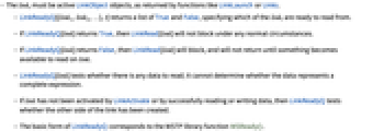 - LinkReadyQ[{link1,link2,…},t] returns a list of True and False, specifying which of the linki are ready to read from.
