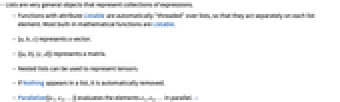 - Functions with attribute Listable are automatically “threaded” over lists, meaning they act separately on each list element. Most built‐in mathematical functions are Listable.
