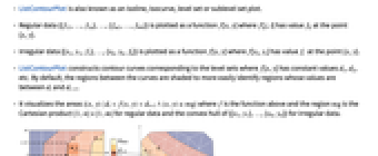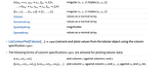 triples {xi,yi,fi}Dataset values as a normal array NumericArray values as a normal array QuantityArray magnitudes SparseArray values as a normal array - ListContourPlot[Tabular[…]cspec] extracts and plots values from the tabular object using the column specification cspec.