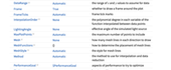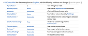 AlignmentPoint Center the default point in the graphic to align with AspectRatio 1 ratio of height to width Axes False whether to draw axes AxesLabel None axes labels AxesOrigin Automatic where axes should cross AxesStyle {} style specifications for the axes Background None background color for the plot BaselinePosition Automatic how to align with a surrounding text baseline BaseStyle {} base style specifications for the graphic BoundaryStyle None how to draw RegionFunction boundaries BoxRatios Automatic effective 3D bounding box ratios ClippingStyle None how to draw values clipped by PlotRange ColorFunction Automatic how to determine the color of regions between contour lines ColorFunctionScaling True whether to scale the argument to ColorFunction ContentSelectable Automatic whether to allow contents to be selected ContourLabels Automatic how to label contour levels Contours Automatic how many or what contours to use ContourShading Automatic how to shade regions between contours ContourStyle Automatic the style for contour lines CoordinatesToolOptions Automatic detailed behavior of the coordinates tool DataRange Automatic the range of x and y values to assume for data Epilog {} primitives rendered after the main plot FormatType TraditionalForm the default format type for text Frame True whether to draw a frame around the plot FrameLabel None frame labels FrameStyle {} style specifications for the frame FrameTicks Automatic frame tick marks FrameTicksStyle {} style specifications for frame ticks GridLines None grid lines to draw GridLinesStyle {} style specifications for grid lines ImageMargins 0. the margins to leave around the graphic ImagePadding All what extra padding to allow for labels etc. ImageSize Automatic the absolute size at which to render the graphic InterpolationOrder None the polynomial degree in each variable of the function interpolated between data points LabelStyle {} style specifications for labels LightingAngle None effective angle of the simulated light source MaxPlotPoints Automatic the maximum number of points to include Mesh None how many mesh lines in each direction to draw MeshFunctions {} how to determine the placement of mesh lines MeshStyle Automatic the style for mesh lines Method Automatic the method to use for interpolation and data reduction PerformanceGoal $PerformanceGoal aspects of performance to try to optimize PlotFit None how to fit a curve to the points PlotFitElements Automatic fitted elements to show in the plot PlotInteractivity $PlotInteractivity whether to allow interactive elements PlotLabel None an overall label for the plot PlotLayout Automatic how to position contours PlotLegends None legends for contour regions PlotRange {Full,Full,Automatic} the range of f or other values to include PlotRangeClipping True whether to clip at the plot range PlotRangePadding Automatic how much to pad the range of values PlotRegion Automatic the final display region to be filled PlotTheme $PlotTheme overall theme for the plot PreserveImageOptions Automatic whether to preserve image options when displaying new versions of the same graphic Prolog {} primitives rendered before the main plot RegionFunction (True&) how to determine whether a point should be included RotateLabel True whether to rotate y labels on the frame ScalingFunctions None how to scale individual coordinates Ticks Automatic axes ticks TicksStyle {} style specifications for axes ticks