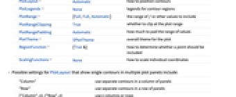 AspectRatio 1 ratio of height to width BoundaryStyle None how to draw RegionFunction boundaries BoxRatios Automatic effective 3D bounding box ratios ClippingStyle None how to draw values clipped by PlotRange ColorFunction Automatic how to determine the color of regions between contour lines ColorFunctionScaling True whether to scale the argument to ColorFunction ContourLabels Automatic how to label contour levels Contours Automatic how many or what contours to use ContourShading Automatic how to shade regions between contours ContourStyle Automatic the style for contour lines DataRange Automatic the range of x and y values to assume for data Frame True whether to draw a frame around the plot FrameTicks Automatic frame tick marks InterpolationOrder None the polynomial degree in each variable of the function interpolated between data points LightingAngle None effective angle of the simulated light source MaxPlotPoints Automatic the maximum number of points to include Mesh None how many mesh lines in each direction to draw MeshFunctions {} how to determine the placement of mesh lines MeshStyle Automatic the style for mesh lines Method Automatic the method to use for interpolation and data reduction PerformanceGoal $PerformanceGoal aspects of performance to try to optimize PlotFit None how to fit a curve to the points PlotFitElements Automatic fitted elements to show in the plot PlotInteractivity $PlotInteractivity whether to allow interactive elements PlotLayout Automatic how to position contours PlotLegends None legends for contour regions PlotRange {Full,Full,Automatic} the range of f or other values to include PlotRangeClipping True whether to clip at the plot range PlotRangePadding Automatic how much to pad the range of values PlotTheme $PlotTheme overall theme for the plot RegionFunction (True&) how to determine whether a point should be included ScalingFunctions None how to scale individual coordinates - Possible settings for PlotLayout that show single contours in multiple plot panels include: