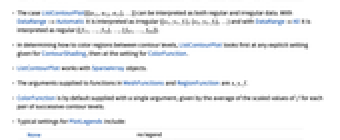 - In determining how to color regions between contour levels, ListContourPlot looks first at any explicit setting given for ContourShading, then at the setting for ColorFunction.