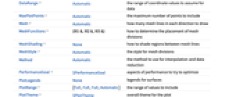 AlignmentPoint Center the default point in the graphic to align with AspectRatio Automatic ratio of height to width Axes True whether to draw axes AxesEdge Automatic on which edges to put axes AxesLabel None axes labels AxesOrigin Automatic where axes should cross AxesStyle {} graphics directives to specify the style for axes Background None background color for the plot BaselinePosition Automatic how to align with a surrounding text baseline BaseStyle {} base style specifications for the graphic BoundaryStyle Automatic how to draw boundaries of regions Boxed True whether to draw the bounding box BoxRatios {1,1,1} bounding 3D box ratios BoxStyle {} style specifications for the box ClipPlanes None clipping planes ClipPlanesStyle Automatic style specifications for clipping planes ColorFunction Automatic how to color contour surfaces ColorFunctionScaling True whether to scale arguments to ColorFunction ContentSelectable Automatic whether to allow contents to be selected Contours 3 how many or what contour surfaces to show ContourStyle White the style for contour surfaces ControllerLinking False when to link to external rotation controllers ControllerPath Automatic what external controllers to try to use DataRange Automatic the range of coordinate values to assume for data Epilog {} 2D graphics primitives to be rendered after the main plot FaceGrids None grid lines to draw on the bounding box FaceGridsStyle {} style specifications for face grids FormatType TraditionalForm default format type for text ImageMargins 0. the margins to leave around the graphic ImagePadding All what extra padding to allow for labels, etc. ImageSize Automatic absolute size at which to render the graphic LabelStyle {} style specifications for labels Lighting Automatic simulated light sources to use MaxPlotPoints Automatic the maximum number of points to include Mesh Automatic how many mesh lines in each direction to draw MeshFunctions {#1&,#2&,#3&} how to determine the placement of mesh divisions MeshShading None how to shade regions between mesh lines MeshStyle Automatic the style for mesh divisions Method Automatic the method to use for interpolation and data reduction PerformanceGoal $PerformanceGoal aspects of performance to try to optimize PlotLabel None a label for the plot PlotLegends None legends for surfaces PlotRange {Full,Full,Full,Automatic} the range of values to include PlotRangePadding Automatic how much to pad the range of values PlotRegion Automatic final display region to be filled PlotTheme $PlotTheme overall theme for the plot PreserveImageOptions Automatic whether to preserve image options when displaying new versions of the same graphic Prolog {} 2D graphics primitives to be rendered before the main plot RegionFunction (True&) how to determine whether a point should be included RotationAction "Fit" how to render after interactive rotation ScalingFunctions None how to scale individual coordinates SphericalRegion Automatic whether to make the circumscribing sphere fit in the final display area TextureCoordinateFunction Automatic how to determine texture coordinates TextureCoordinateScaling True whether to scale arguments to TextureCoordinateFunction Ticks Automatic specification for ticks TicksStyle {} style specification for ticks TouchscreenAutoZoom False whether to zoom to fullscreen when activated on a touchscreen ViewAngle Automatic angle of the field of view ViewCenter Automatic point to display at the center ViewMatrix Automatic explicit transformation matrix ViewPoint {1.3,-2.4,2.} viewing position ViewProjection Automatic projection method for rendering objects distant from the viewer ViewRange All range of viewing distances to include ViewVector Automatic position and direction of a simulated camera ViewVertical {0,0,1} direction to make vertical
