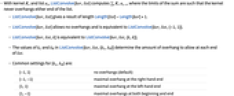 {-1,1} no overhangs (default) {-1,-1} maximal overhang at the right‐hand end {1,1} maximal overhang at the left‐hand end {1,-1} maximal overhangs at both beginning and end - With maximal overhang at one end only, the result from ListConvolve is the same length as list.
