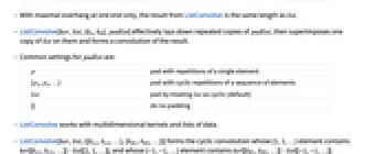 - ListConvolve[ker,list,{kL,kR},padlist] effectively lays down repeated copies of padlist, then superimposes one copy of list on them and forms a convolution of the result.