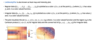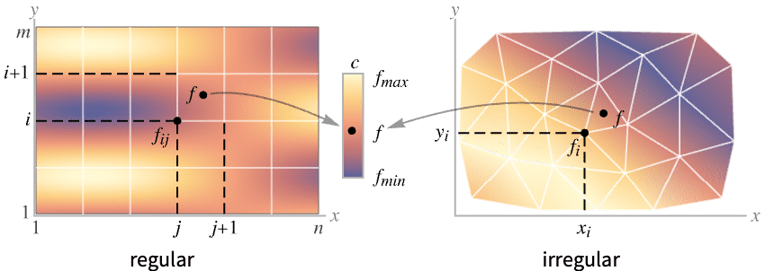 has value fij and c is a color-valued function. - Irregular data {{x1,y1,f1},…,{xk,yk,fk}} is plotted as a color