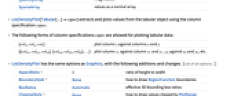 {colx,coly,colz} plot column z against columns x and y {{colx1,coly1,colz1},{colx2,coly2,colz2},…} plot column z1 against column x1 and y1 , z2 against x2 and y2, etc. - ListDensityPlot has the same options as Graphics, with the following additions and changes: [List of all options]