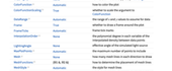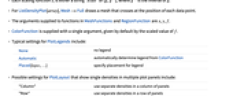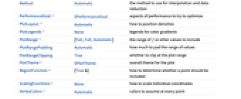 AlignmentPoint Center the default point in the graphic to align with AspectRatio 1 ratio of height to width Axes False whether to draw axes AxesLabel None axes labels AxesOrigin Automatic where axes should cross AxesStyle {} style specifications for the axes Background None background color for the plot BaselinePosition Automatic how to align with a surrounding text baseline BaseStyle {} base style specifications for the graphic BoundaryStyle None how to draw RegionFunction boundaries BoxRatios Automatic effective 3D bounding box ratios ClippingStyle None how to draw values clipped by PlotRange ColorFunction Automatic how to color the plot ColorFunctionScaling True whether to scale the argument to ColorFunction ContentSelectable Automatic whether to allow contents to be selected CoordinatesToolOptions Automatic detailed behavior of the coordinates tool DataRange Automatic the range of x and y values to assume for data Epilog {} primitives rendered after the main plot FormatType TraditionalForm the default format type for text Frame True whether to draw a frame around the plot FrameLabel None frame labels FrameStyle {} style specifications for the frame FrameTicks Automatic frame tick marks FrameTicksStyle {} style specifications for frame ticks GridLines None grid lines to draw GridLinesStyle {} style specifications for grid lines ImageMargins 0. the margins to leave around the graphic ImagePadding All what extra padding to allow for labels etc. ImageSize Automatic the absolute size at which to render the graphic InterpolationOrder None the polynomial degree in each variable of the interpolated density between data points LabelStyle {} style specifications for labels LightingAngle None effective angle of the simulated light source MaxPlotPoints Automatic the maximum number of points to include Mesh None how many mesh lines in each direction to draw MeshFunctions {#1&,#2&} how to determine the placement of mesh lines MeshStyle Automatic the style for mesh lines Method Automatic the method to use for interpolation and data reduction PerformanceGoal $PerformanceGoal aspects of performance to try to optimize PlotFit None how to fit a curve to the points PlotFitElements Automatic fitted elements to show in the plot PlotLabel None an overall label for the plot PlotLayout Automatic how to position densities PlotLegends None legends for color gradients PlotRange {Full,Full,Automatic} the range of f or other values to include PlotRangeClipping True whether to clip at the plot range PlotRangePadding Automatic how much to pad the range of values PlotRegion Automatic the final display region to be filled PlotTheme $PlotTheme overall theme for the plot PreserveImageOptions Automatic whether to preserve image options when displaying new versions of the same graphic Prolog {} primitives rendered before the main plot RegionFunction (True&) how to determine whether a point should be included RotateLabel True whether to rotate y labels on the frame ScalingFunctions None how to scale individual coordinates Ticks Automatic axes ticks TicksStyle {} style specifications for axes ticks VertexColors Automatic colors to assume at every point