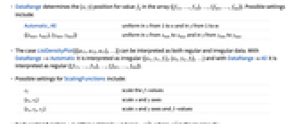 Automatic,All uniform in x from 1 to n and in y from 1 to m {{xmin,xmax},{ymin,ymax}} uniform in x from xmin to xmax and in y from ymin to ymax - The case ListDensityPlot[{{a11,a12,a13},…}] can be interpreted as both regular and irregular data. With DataRange->Automatic it is interpreted as irregular {{x1,y1,f1},{x2,y2,f2},…} and with DataRangeAll it is interpreted as regular {{f11,…,f1n},…,{fm1,…,fmn}}.