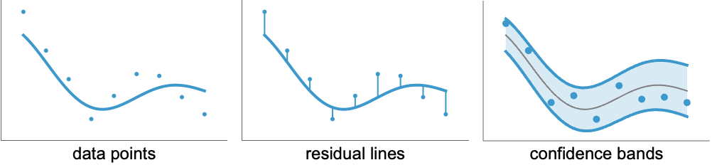 - Furthermore, it is easy to show quality measures of the fitted model such as confidence bands or residuals: