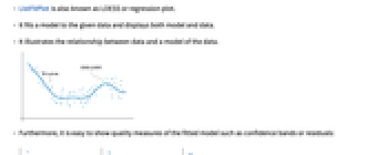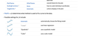 AspectRatio 1/GoldenRatio ratio of height to width Axes True whether to draw axes ClippingStyle None what to draw when lines are clipped ColorFunction Automatic how to determine the coloring of lines ColorFunctionScaling True whether to scale arguments to ColorFunction DataRange Automatic the range of x values to assume for data Filling None filling under each line FillingStyle Automatic style to use for filling InterpolationOrder None the polynomial degree of curves used in joining data points IntervalMarkers Automatic how to render uncertainty IntervalMarkersStyle Automatic style for uncertainty elements LabelingFunction Automatic how to label points LabelingSize Automatic maximum size of callouts and labels LabelingTarget Automatic how to determine automatic label positions MaxPlotPoints Infinity the maximum number of points to include Mesh None how many mesh points to draw on each line MeshFunctions {#1&} how to determine the placement of mesh points MeshShading None how to shade regions between mesh points MeshStyle Automatic the style for mesh points Method Automatic methods to use MultiaxisArrangement None how to arrange multiple axes for data PerformanceGoal $PerformanceGoal aspects of performance to try to optimize PlotFit Automatic how to fit a curve to the points PlotFitElements Automatic fitted elements to show in the plot PlotHighlighting Automatic highlighting effect for points PlotInteractivity $PlotInteractivity whether to allow interactive elements PlotLabel None overall label for the plot PlotLabels None labels for data PlotLayout "Overlaid" how to position data PlotLegends None legends for data PlotMarkers None markers to use to indicate each point PlotRange Automatic range of values to include PlotRangeClipping True whether to clip at the plot range PlotStyle Automatic graphics directives to determine the style of each line PlotTheme $PlotTheme overall theme for the plot ScalingFunctions None how to scale individual coordinates TargetUnits Automatic units to display in the plot - PlotFitfit determines what method is used to fit a curve to the data.