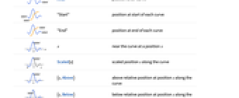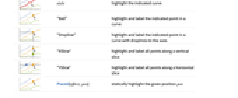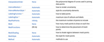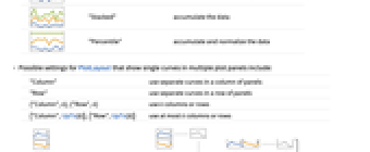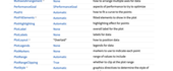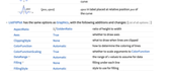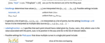 AlignmentPoint Center the default point in the graphic to align with AspectRatio 1/GoldenRatio ratio of height to width Axes True whether to draw axes AxesLabel None axes labels AxesOrigin Automatic where axes should cross AxesStyle {} style specifications for the axes Background None background color for the plot BaselinePosition Automatic how to align with a surrounding text baseline BaseStyle {} base style specifications for the graphic ClippingStyle None what to draw when lines are clipped ColorFunction Automatic how to determine the coloring of lines ColorFunctionScaling True whether to scale arguments to ColorFunction ContentSelectable Automatic whether to allow contents to be selected CoordinatesToolOptions Automatic detailed behavior of the coordinates tool DataRange Automatic the range of x values to assume for data Epilog {} primitives rendered after the main plot Filling None filling under each line FillingStyle Automatic style to use for filling FormatType TraditionalForm the default format type for text Frame False whether to put a frame around the plot FrameLabel None frame labels FrameStyle {} style specifications for the frame FrameTicks Automatic frame ticks FrameTicksStyle {} style specifications for frame ticks GridLines None grid lines to draw GridLinesStyle {} style specifications for grid lines ImageMargins 0. the margins to leave around the graphic ImagePadding All what extra padding to allow for labels etc. ImageSize Automatic the absolute size at which to render the graphic InterpolationOrder None the polynomial degree of curves used in joining data points IntervalMarkers Automatic how to render uncertainty IntervalMarkersStyle Automatic style for uncertainty elements LabelingFunction Automatic how to label points LabelingSize Automatic maximum size of callouts and labels LabelingTarget Automatic how to determine automatic label positions LabelStyle {} style specifications for labels MaxPlotPoints Infinity the maximum number of points to include Mesh None how many mesh points to draw on each line MeshFunctions {#1&} how to determine the placement of mesh points MeshShading None how to shade regions between mesh points MeshStyle Automatic the style for mesh points Method Automatic methods to use MultiaxisArrangement None how to arrange multiple axes for data PerformanceGoal $PerformanceGoal aspects of performance to try to optimize PlotFit Automatic how to fit a curve to the points PlotFitElements Automatic fitted elements to show in the plot PlotHighlighting Automatic highlighting effect for points PlotInteractivity $PlotInteractivity whether to allow interactive elements PlotLabel None overall label for the plot PlotLabels None labels for data PlotLayout "Overlaid" how to position data PlotLegends None legends for data PlotMarkers None markers to use to indicate each point PlotRange Automatic range of values to include PlotRangeClipping True whether to clip at the plot range PlotRangePadding Automatic how much to pad the range of values PlotRegion Automatic the final display region to be filled PlotStyle Automatic graphics directives to determine the style of each line PlotTheme $PlotTheme overall theme for the plot PreserveImageOptions Automatic whether to preserve image options when displaying new versions of the same graphic Prolog {} primitives rendered before the main plot RotateLabel True whether to rotate y labels on the frame ScalingFunctions None how to scale individual coordinates TargetUnits Automatic units to display in the plot Ticks Automatic axes ticks TicksStyle {} style specifications for axes ticks