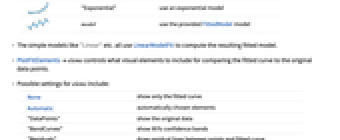 None show only the fitted curve Automatic automatically chosen elements "DataPoints" show the original data "BandCurves" show 95% confidence bands "Residuals" draw residual lines between points and fitted curve {elem,<|"param"value,…|>} modify the parameter "param" for elem {elem1,elem2,…} combine multiple visual elements - DataRange determines how values {y1,…,yn} are interpreted into {{x1,y1},…,{xn,yn}}. Possible settings include: