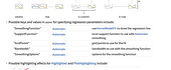 "SmoothingFunction" Automatic use KernelModelFit to draw the regression line "SupportFunction" Automatic local support function to use with Automatic smoothing "GridPoints" Automatic grid points to use for the fit "Bandwidth" Automatic bandwidth to use with the smoothing function "SmoothingOptions" Automatic options for the smoothing function - Possible highlighting effects for Highlighted and PlotHighlighting include: