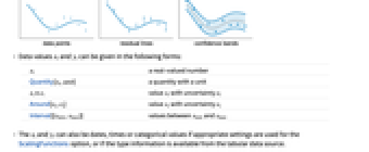 xi a real-valued number Quantity[xi,unit] a quantity with a unit xi±ei value xi with uncertainty ei Around[xi,ei] value xi with uncertainty ei Interval[{xmin,xmax}] values between xmin and xmax - The xi and yi can also be dates, times or categorical values if appropriate settings are used for the ScalingFunctions option, or if the type information is available from the tabular data source.