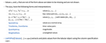 <|"k1"y1,"k2"y2,…|> values {y1,y2,…} <|x1y1,x2y2,…|> key-value pairs {{x1,y1},{x2,y2},…} {y1"lbl1",y2"lbl2",…}, {y1,y2,…}{"lbl1","lbl2",…} values {y1,y2,…} with labels {lbl1,lbl2,…} SparseArray values as a normal array TimeSeries, EventSeries time-value pairs QuantityArray magnitudes WeightedData unweighted values - ListFitPlot[Tabular[…]cspec] extracts and plots values from the tabular object using the column specification cspec.