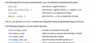 {colx,coly} plot column y against column x {{colx1,coly1},{colx2,coly2},…} plot column y1 against column x1, y2 against x2, etc. coly, {coly} plot column y as a sequence of values {{coly1},…,{colyi},…} plot columns y1, y2, etc. as sequences of values - The colx can also be Automatic, in which case sequential values are generated using DataRange.