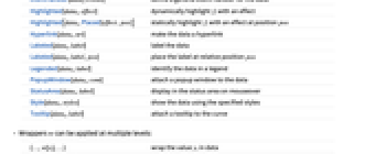 Annotation[datai,label] provide an annotation for the data Button[datai,action] define an action to execute when the data is clicked Callout[datai,label] label the data with a callout Callout[datai,label,pos] place the callout at relative position pos EventHandler[datai,events] define a general event handler for the data Highlighted[datai,effect] dynamically highlight fi with an effect Highlighted[datai,Placed[effect,pos]] statically highlight fi with an effect at position pos Hyperlink[datai,uri] make the data a hyperlink Labeled[datai,label] label the data Labeled[datai,label,pos] place the label at relative position pos Legended[datai,label] identify the data in a legend PopupWindow[datai,cont] attach a popup window to the data StatusArea[datai,label] display in the status area on mouseover Style[datai,styles] show the data using the specified styles Tooltip[datai,label] attach a tooltip to the curve - Wrappers w can be applied at multiple levels: