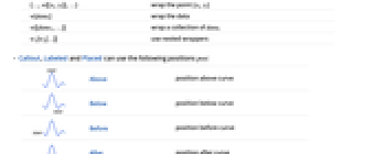 {…,w[yi],…} wrap the value yi in data {…,w[{xi,yi}],…} wrap the point {xi,yi} w[datai] wrap the data w[{data1,…}] wrap a collection of datai w1[w2[…]] use nested wrappers - Callout, Labeled and Placed can use the following positions pos: