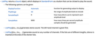 DisplayFunction Automatic function for generating output to display PlayRange All the range of amplitude levels to include SampleDepth 8 how many bits to use to represent each amplitude level SampleRate 8000 how many times per second amplitude samples should be generated - ListPlay[{list1,list2}] generates stereo sound. The left‐hand channel is given first.