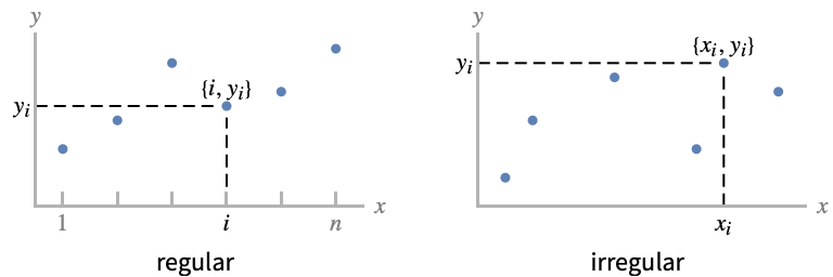 - Irregular data {{x1,y1},…,{xn,yn}} is plotted as points {xi,yi}.