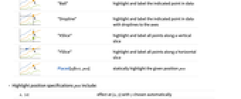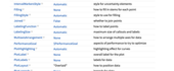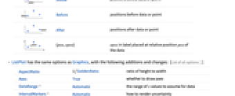 AlignmentPoint Center the default point in the graphic to align with AspectRatio 1/GoldenRatio ratio of height to width Axes True whether to draw axes AxesLabel None axes labels AxesOrigin Automatic where axes should cross AxesStyle {} style specifications for the axes Background None background color for the plot BaselinePosition Automatic how to align with a surrounding text baseline BaseStyle {} base style specifications for the graphic ColorFunction Automatic how to determine the coloring of points ColorFunctionScaling True whether to scale data to ColorFunction ContentSelectable Automatic whether to allow contents to be selected CoordinatesToolOptions Automatic detailed behavior of the coordinates tool DataRange Automatic the range of x values to assume for data Epilog {} primitives rendered after the main plot Filling None how to fill in stems for each point FillingStyle Automatic style to use for filling FormatType TraditionalForm the default format type for text Frame False whether to put a frame around the plot FrameLabel None frame labels FrameStyle {} style specifications for the frame FrameTicks Automatic frame ticks FrameTicksStyle {} style specifications for frame ticks GridLines None grid lines to draw GridLinesStyle {} style specifications for grid lines ImageMargins 0. the margins to leave around the graphic ImagePadding All what extra padding to allow for labels etc. ImageSize Automatic the absolute size at which to render the graphic IntervalMarkers Automatic how to render uncertainty IntervalMarkersStyle Automatic style for uncertainty elements Joined False whether to join points LabelingFunction Automatic how to label points LabelingSize Automatic maximum size of callouts and labels LabelingTarget Automatic how to determine automatic label positions LabelStyle {} style specifications for labels Method Automatic details of graphics methods to use MultiaxisArrangement None how to arrange multiple axes for data PerformanceGoal $PerformanceGoal aspects of performance to try to optimize PlotFit None how to fit a curve to the points PlotFitElements Automatic fitted elements to show in the plot PlotHighlighting Automatic highlighting effect for curves PlotInteractivity $PlotInteractivity whether to allow interactive elements PlotLabel None overall label for the plot PlotLabels None labels for data PlotLayout "Overlaid" how to position data PlotLegends None legends for data PlotMarkers None markers to use to indicate each point PlotRange Automatic range of values to include PlotRangeClipping True whether to clip at the plot range PlotRangePadding Automatic how much to pad the range of values PlotRegion Automatic the final display region to be filled PlotStyle Automatic graphics directives to determine styles of points PlotTheme $PlotTheme overall theme for the plot PreserveImageOptions Automatic whether to preserve image options when displaying new versions of the same graphic Prolog {} primitives rendered before the main plot RotateLabel True whether to rotate y labels on the frame ScalingFunctions None how to scale individual coordinates TargetUnits Automatic units to display in the plot Ticks Automatic axes ticks TicksStyle {} style specifications for axes ticks