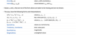 xi a real-valued number Quantity[xi,unit] a quantity with a unit Around[xi,ei] value xi with uncertainty ei Interval[{xmin,xmax}] values between xmin and xmax - Values xi and yi that are not of the form above are taken to be missing and are not shown.