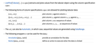 {colx,coly} plot column y against column x {{colx1,coly1},{colx2,coly2},…} plot column y1 against column x1, y2 against x2, … coly, {coly} plot column y as a sequence of values {{coly1},…,{colyi},…} plot columns y1, y2, … as sequences of values - The colx can also be Automatic, in which case, sequential values are generated using DataRange.