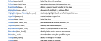 Annotation[datai,label] provide an annotation for the data Button[datai,action] define an action to execute when the data is clicked Callout[datai,label] label the data with a callout Callout[datai,label,pos] place the callout at relative position pos EventHandler[datai,…] define a general event handler for the data Highlighted[datai,effect] dynamically highlight fi with an effect Highlighted[datai,Placed[effect,pos]] statically highlight fi with an effect at position pos Hyperlink[datai,uri] make the data a hyperlink Labeled[datai,label] label the data Labeled[datai,label,pos] place the label at relative position pos Legended[datai,label] identify the data in a legend PopupWindow[datai,cont] attach a popup window to the data StatusArea[datai,label] display in the status area on mouseover Style[datai,styles] show the data using the specified styles Tooltip[datai,label] attach a tooltip to the data Tooltip[datai] use data values as tooltips - Wrappers w can be applied at multiple levels: