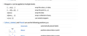{…,w[yi],…} wrap the value yi in data {…,w[{xi,yi}],…} wrap the point {xi,yi} w[datai] wrap the data w[{data1,…}] wrap a collection of datai w1[w2[…]] use nested wrappers - Callout, Labeled, and Placed can use the following positions pos: