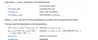 xi a real-valued number Quantity[xi,unit] a quantity with a unit Around[xi,ei] value xi with uncertainty ei Interval[{xmin,xmax}] values between xmin and xmax - Values xi, yi and zi that are not of the preceding form are taken to be missing and are not shown.