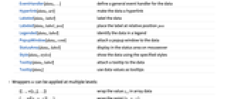Annotation[datai,label] provide an annotation for the data Button[datai,action] define an action to execute when the data is clicked Callout[datai,label] label the data with a callout Callout[datai,label,pos] place the callout at relative position pos EventHandler[datai,…] define a general event handler for the data Hyperlink[datai,uri] make the data a hyperlink Labeled[datai,label] label the data Labeled[datai,label,pos] place the label at relative position pos Legended[datai,label] identify the data in a legend PopupWindow[datai,cont] attach a popup window to the data StatusArea[datai,label] display in the status area on mouseover Style[datai,styles] show the data using the specified styles Tooltip[datai,label] attach a tooltip to the data Tooltip[datai] use data values as tooltips - Wrappers w can be applied at multiple levels: